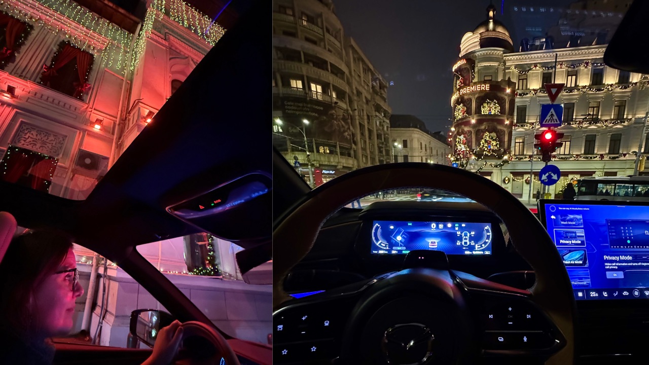 Display-ul este generos, are 14,6 inch, practic cât ecranul laptoului meu, și are un layout și funcționalități inspirate de smartphone-uri. Singurul lucru provocator la început este să înveți unde găsești comenzile, pentru că tot ce știai a fi analog pe alte mașini, pe Mazda 6e devine digital.